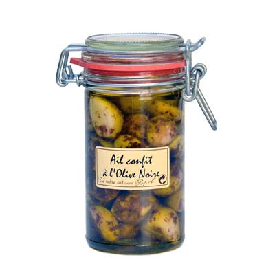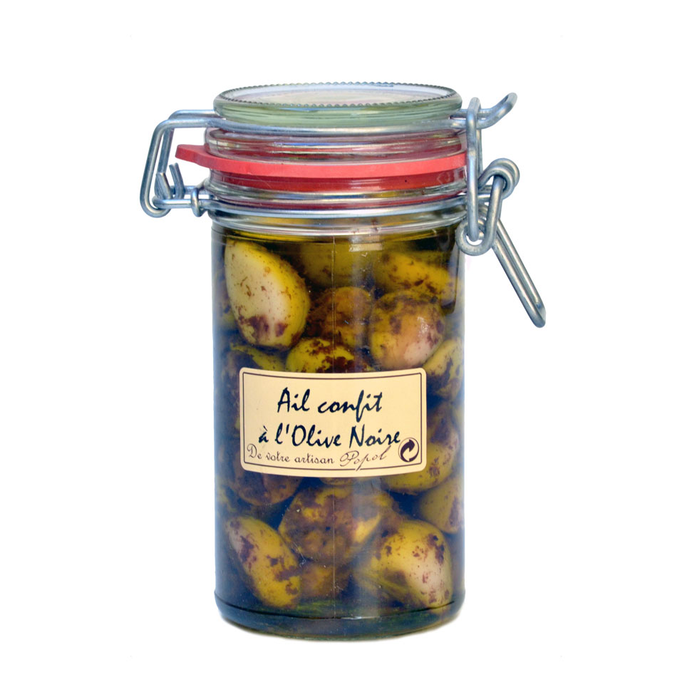 Ail confit à l'olive noire Popol. Ingrédients : ail 56%, huile d'olive vierge extra... Poids net égoutté : 160g.