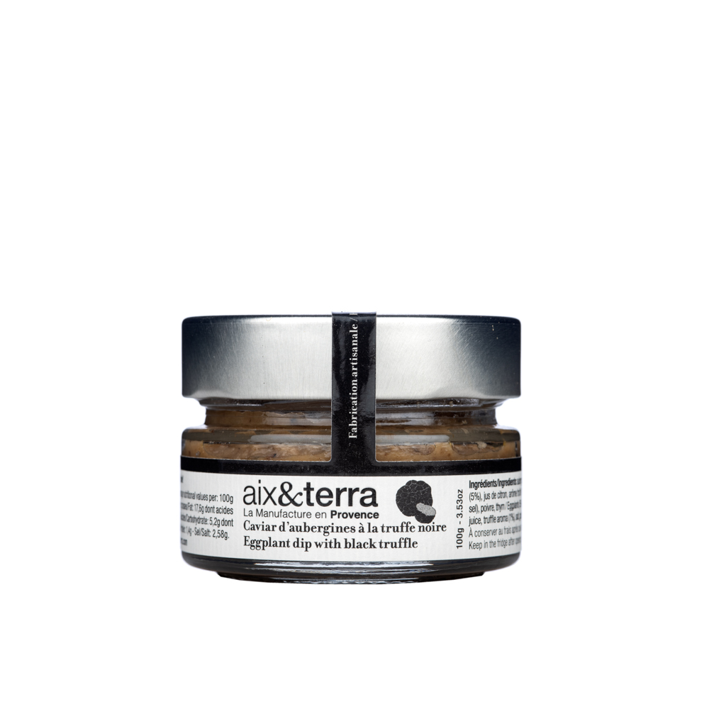 Le caviar d'aubergine est un grand classique de la cuisine méditerranéenne. L'association des aubergines avec la truffe, le diamant noir de Provence, fait de ce produit une version raffinée et luxueuse. Le choix de la variété des aubergines provençales et le soin apporté lors de la préparation de cette recette permettent d'avoir un tartinable très goûteux et fin. Le tout est relevé par le goût puisant de la truffe noire, la Tuber Melanosporom d'hiver.
