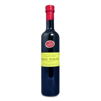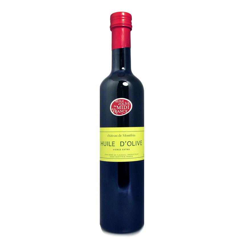 La bouteille de 50 cl. Huile de catégorie supérieure obtenue directement des olives et uniquement par des procédés mécaniques. Producteur : Château Montfrin, produit de France.