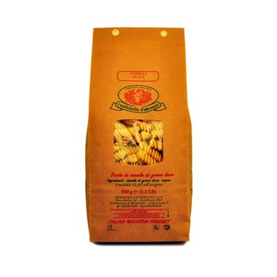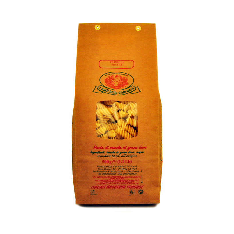 "Pâtes "fusillotti". Pâtes alimentaires de qualité supérieure à la semoule de blé dur. Ces Fusillotti s'accompagnent à merveille de sauces. Cuisson : 8-11 min Le sachet kraft de 500 gr. Producteur : Rustichella d'Abruzzo. Ingrédients : semoule de blé dur, eau.