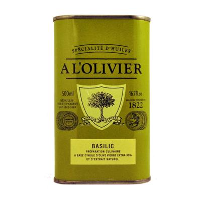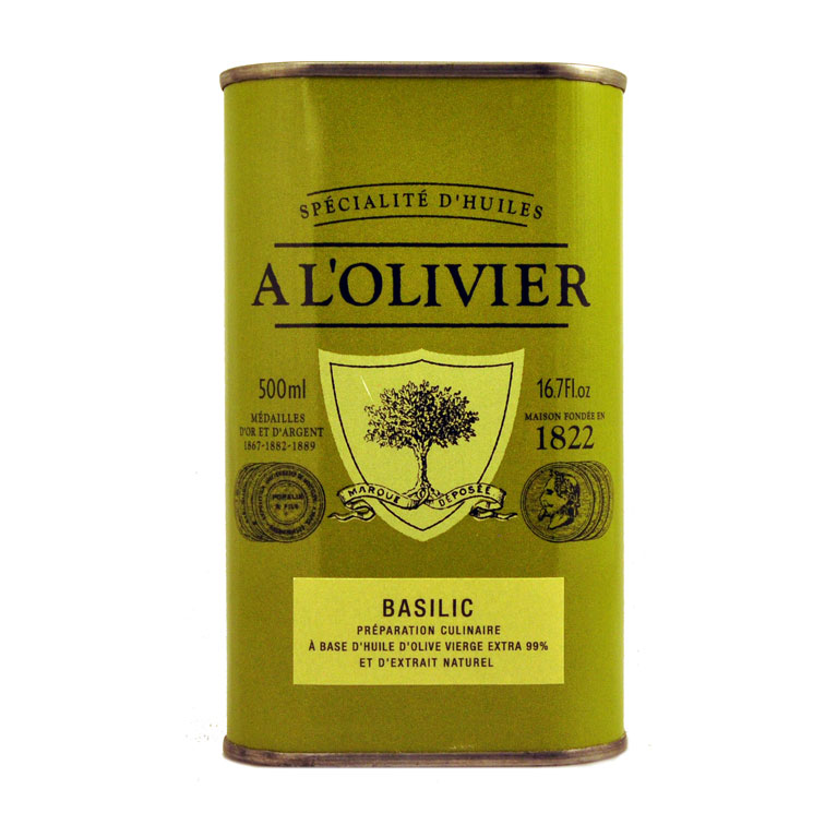 Préparation culinaire à base d'huile d'olive et de basilic.Ingrédients :huile d'olive, extrait naturel de basilic. Producteur : L'Olivier,produit de France. Huile d'olive au basilic à l'Oliviers. Le bidon de 50 cl