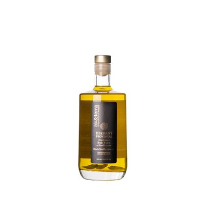 La Truffe tient une place privilégiée dans la gamme aix&terra. La Manufacture propose plus d'une dizaine de créations élaborées avec la truffe d'hiver tuber melanosporum et la truffe d'été tuber aestivum, toutes les deux cultivées en Provence. Parmi elles, l'huile d'olive Tanche des Barronies (Nyons) élaborée artisanalement avec des olives noires et agrémentée d'une Truffe Noire tuber melanosporum de Provence. Ce flacon mêle les senteurs puissantes de la tuber melanosporum et les saveurs fruitées de l'olive provençale.