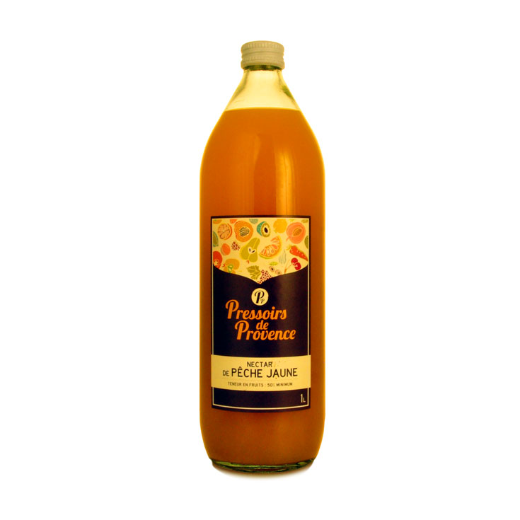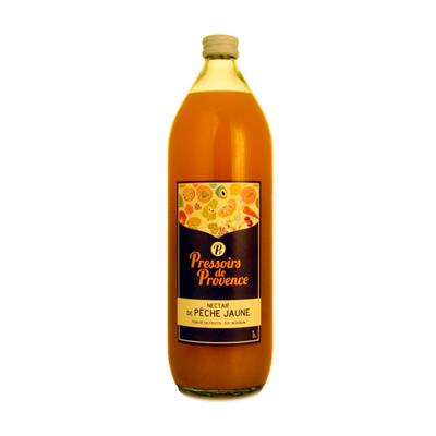 Nectar pêche jaune. Une teneur en fruit de 50% minimum pour ce délicieux nectar de pêche jaune à la fabrication artisanale. La pêche jaune. Douce et spécialementfondante dans la bouche, elle attire par son petit goût bienparticulier. La bouteille de 1 litre. Producteur : Pressoirs de Provence, produit de France.