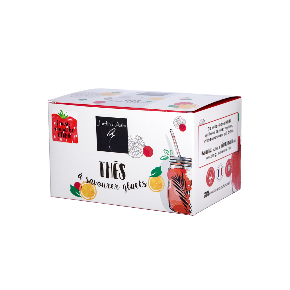 Délicieux thé vert sencha de Chine parfumé à la fraise et à la rhubarbe. Ce thé glacé s'infuse dans 20 à 25cl d'eau glacée. Conditionné en boite de 15 sachets individuels.